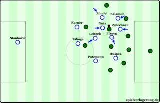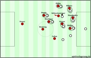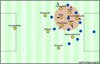 게겐프레싱을 사용하는 팀들의 수비라인을 살펴보면 다른 팀들보다 상대적으로 최종수비라인이 하프라인 가까이 위치되어 있음을 알 수 있다. 즉, 선수들 간의 간격을 조밀하게 형성하여 압박 시 소모되는 체력의 양을 줄인다는 것이다.